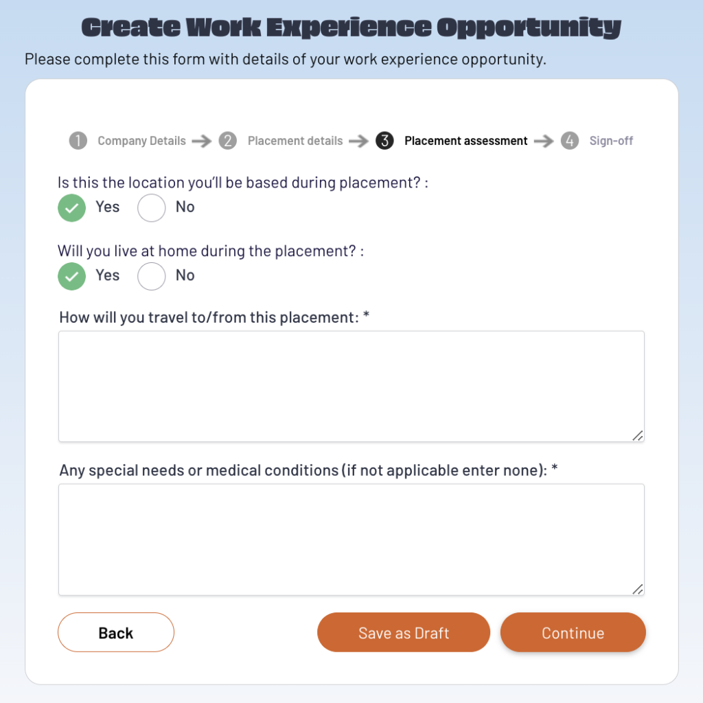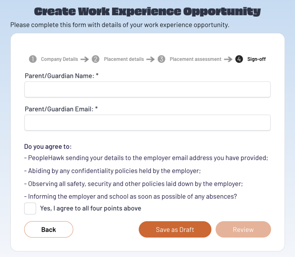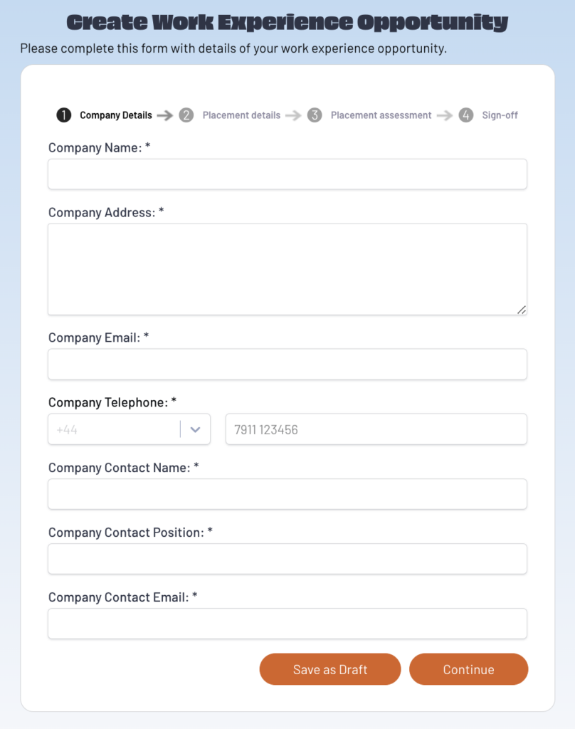 Carefully complete all required fields about the company or organisation you wish to attend for work experience. If you are unsure of any answers you can save the form in draft.