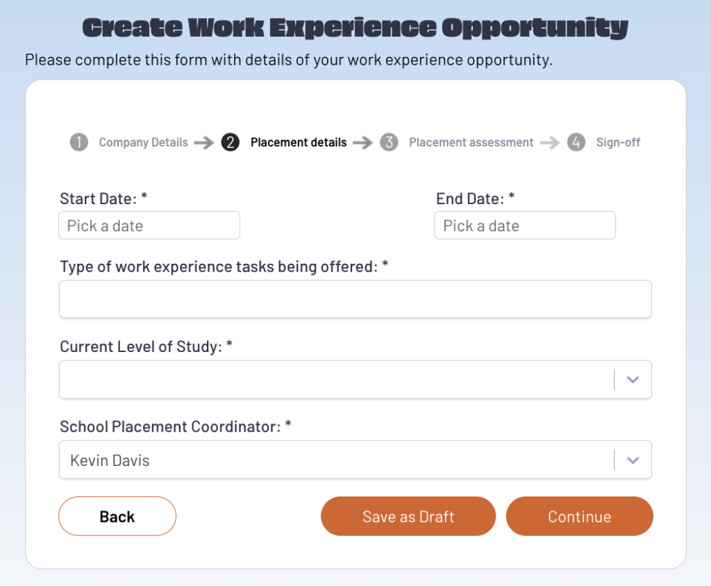 Please ensure the start and end dates are accurate to cover the full period you will be on work experience, a brief description of what you will do and select your current level of study from the dropdown.
