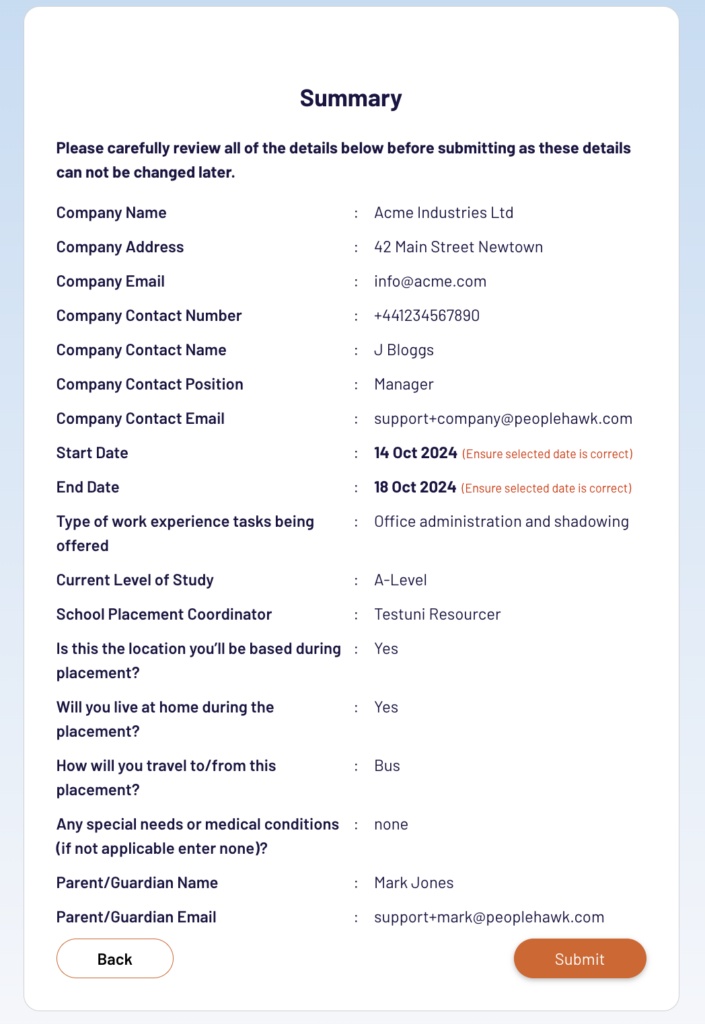 Ensure the dates, company contact email and parent/guardian email are all accurate and valid.