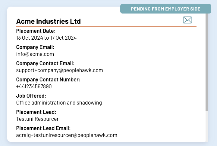 The email sent to the company or parent/guardian will show as from PeopleHawk and not you or the school. The contents of the email will however refer to you and your school. Ask them to search for emails from PeopleHawk and to also check their junk mail folder.